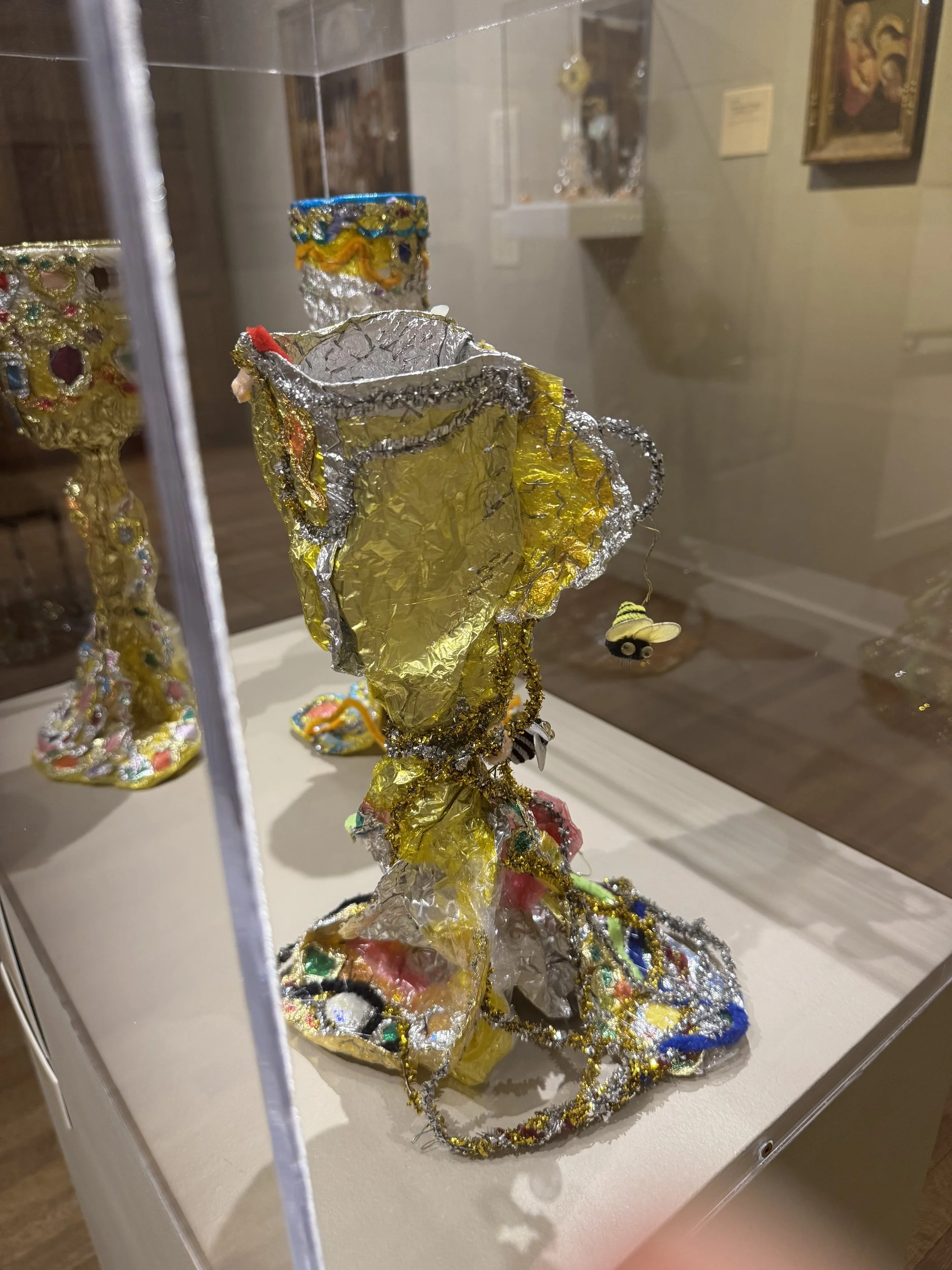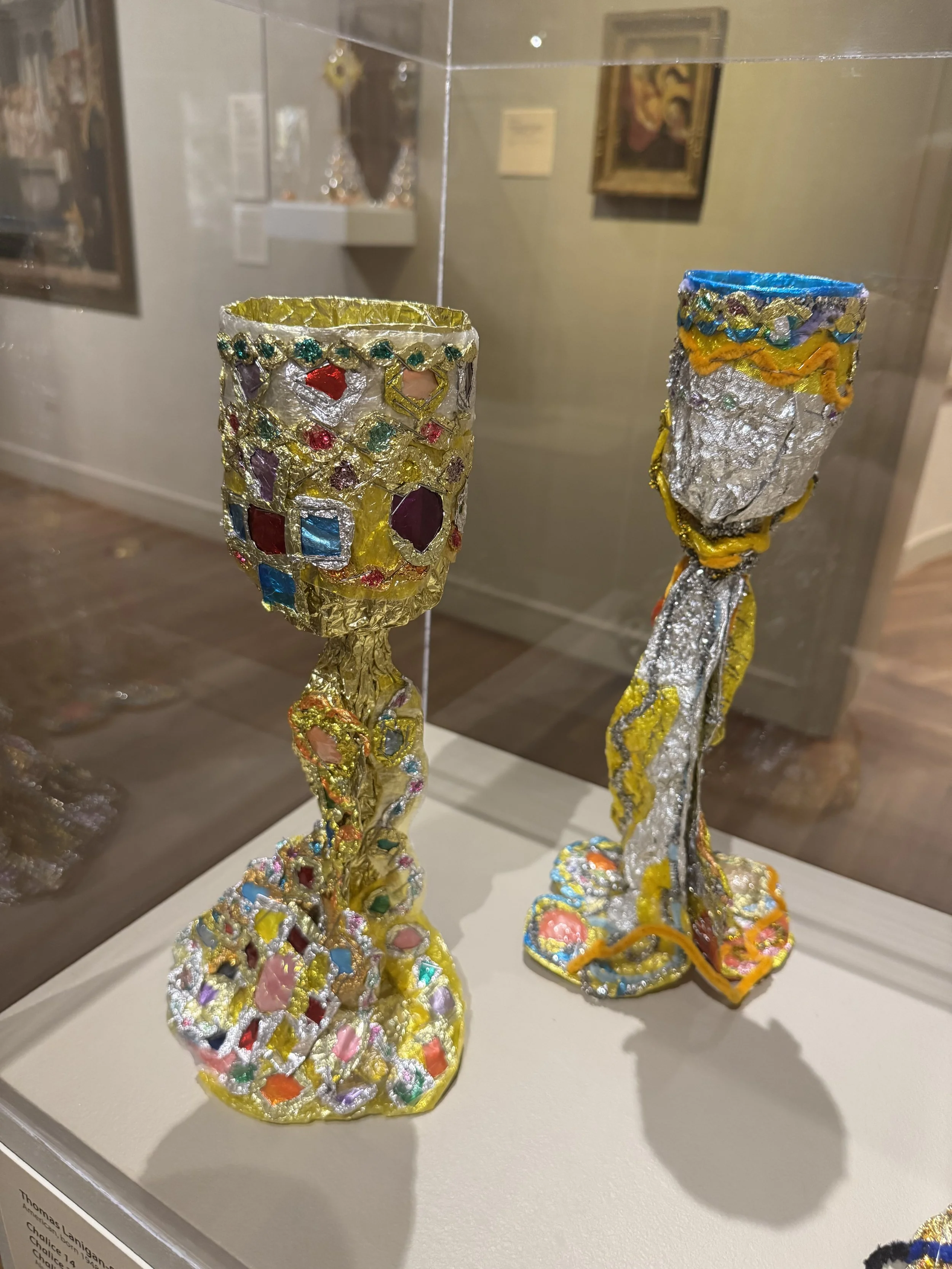 Back in May, I visited my friend and fellow painter Sarah Moore in San Antonio. While there, we toured many beautiful places, The McNay Art Museum being one of them. There I saw “Chalices” by Thomas Lanigan-Schmidt, goblets made of colorful candy foils and other assorted trash. (Please click on the link of his name. I swoon.)