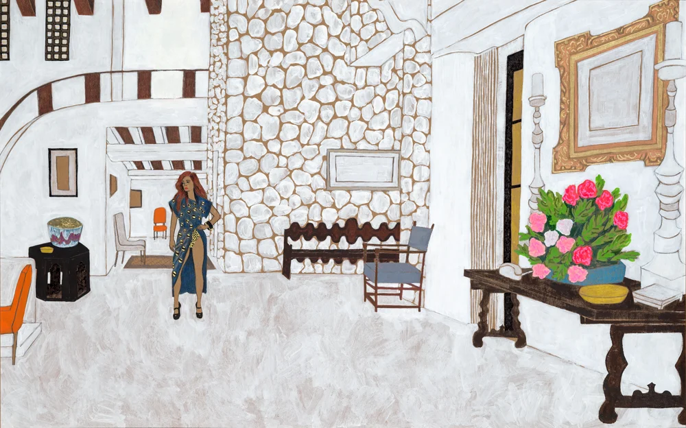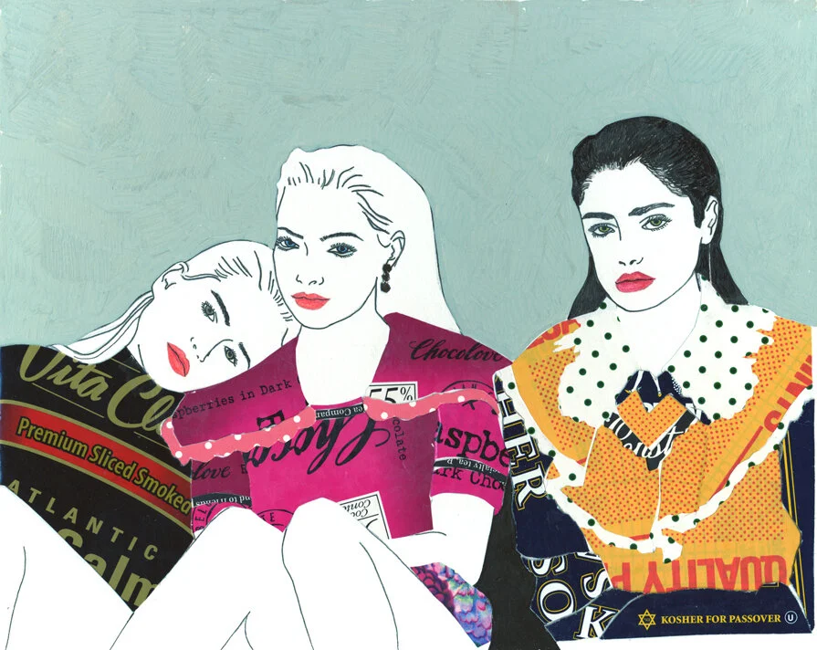 Mixed media paintings, drawings, and collage, all inspired by fashion.